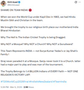 कीर्ति आजाद ने सोशल मीडिया प्लेटफार्म एक्स पर लिखा, ‘शर्म करो टीम इंडिया, जब हमने साल 1983 में कपिल देव की कप्तानी में वर्ल्ड कप जीता था, तब हमारी टीम में हिंदू, मुस्लिम, सिख और ईसाई धर्म के लोग थे। हम ट्रॉफी को अपनी धार्मिक जन्मभूमि, अपनी मातृभूमि भारत-हिंदुस्तान लाए थे। अभी भारतीय क्रिकेट टीम की ट्रॉफी को क्यों घसीटा जा रहा है? मस्जिद क्यों नहीं? चर्च क्यों नहीं? उन्होंने मोहम्मद सिराज और संजू सैमसन का उदाहरण देते हुए कहा कि प्लेयर ऑफ द टूर्नामेंट रहने के बावजूद संजू इसे चर्च नहीं ले गए और न ही सिराज इसे मस्जिद लेकर गए।