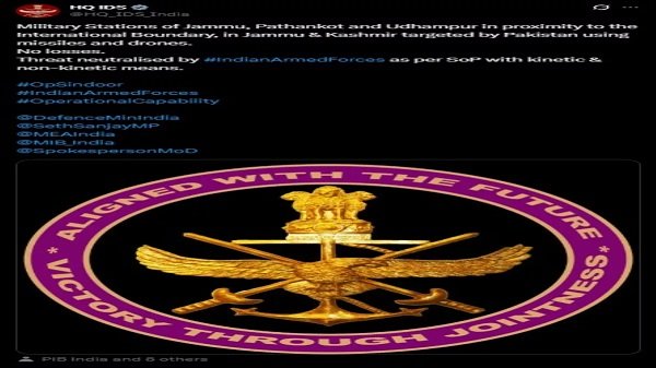 Pakistani Drone Attack : ऑपरशन सिंदूर से बौखलाहट में पाकिस्तान ने जम्मू-कश्मीर में नियंत्रण रेखा और अंतरराष्ट्रीय सीमा पर गोलाबारी तेज कर दी है। शाम होते-होते उसने जम्मू, पठानकोट के अलावा राजस्थान के जैसलमेर में मिसाइलों व ड्रोन से फिर हमले करने की कोशिश की। अब इसी को लेकर भारतीय सेना का बयान आया है। भारतीय सेना के हेडक्वार्टर इंटीग्रेटेड डिफेंस स्टाफ ने एक्स पर लिखकर बताया कि पाकिस्तान की ओर से जम्मू, पठानकोट और उधमपुर के सैन्य स्टेशनों पर मिसाइड और ड्रोन से निशाना बनाया गया। भारतीय सेना ने पाकिस्तान की तरफ से किए गए ड्रोन हमलों को नाकाम कर दिया।