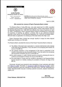 रायपुर डेस्क। देश के डिजिटल पेमेंट सेक्टर में बड़ा झटका लगा है। RBI ने Paytm Payments Bank का लाइसेंस सीधे रद्द कर दिया है। अब यह बैंकिंग ऑपरेशन नहीं कर पाएगा।