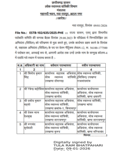 रायपुर। छत्तीसगढ़ शासन के लोक स्वास्थ्य यांत्रिकी (PHE) विभाग में पदोन्नति का आदेश जारी किया गया है। विभागीय पदोन्नति समिति की बैठक में लिए गए निर्णय के अनुसार उप अभियंताओं (सिविल) को सहायक अभियंता (सिविल) के पद पर पदोन्नत किया गया है।