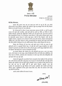 पीएम मोदी ने चिट्ठी के आखिर में लिखा है कि लोकतंत्र की खूबसूरती जनभागीदारी और जनसहयोग में है। देशहित में बड़े फैसले लेने, बड़ी योजनाएं बनाने और सुचारू रूप से लागू कर पाने में आपका समर्थन ही मुझे अपार शक्ति देता है। उन्होंने लिखा, “जब हम एक विकसित भारत के निर्माण के संकल्प को पूरा करने के लिए काम कर रहे हैं तो मुझे आपके विचारों, सुझावों और सहयोग की आवश्यकता है। मुझे विश्वास है कि आपका आशीर्वाद और समर्थन हमें निरंतर मिलता रहेगा। राष्ट्रनिर्माण के लिए हमारे प्रयास बिना थके, बिना रुके अनवरत जारी रहेंगे। आपको उज्जवल भविष्य की शुभकामनाएं।”