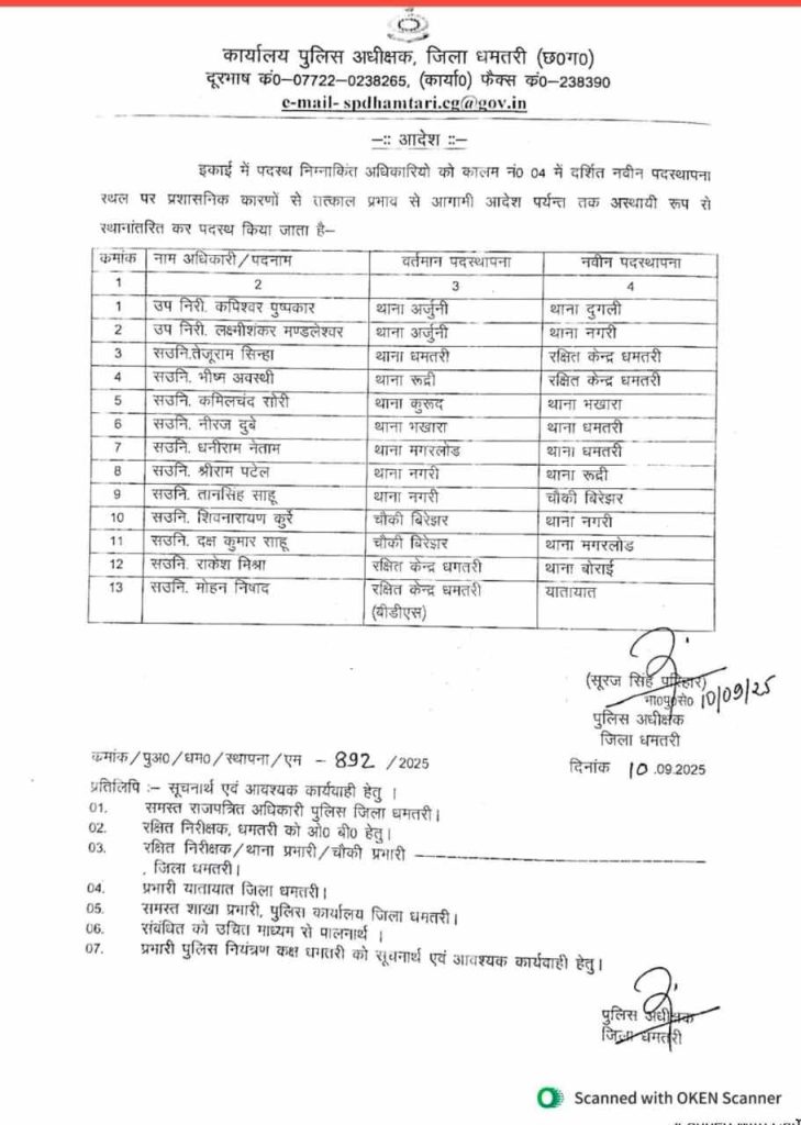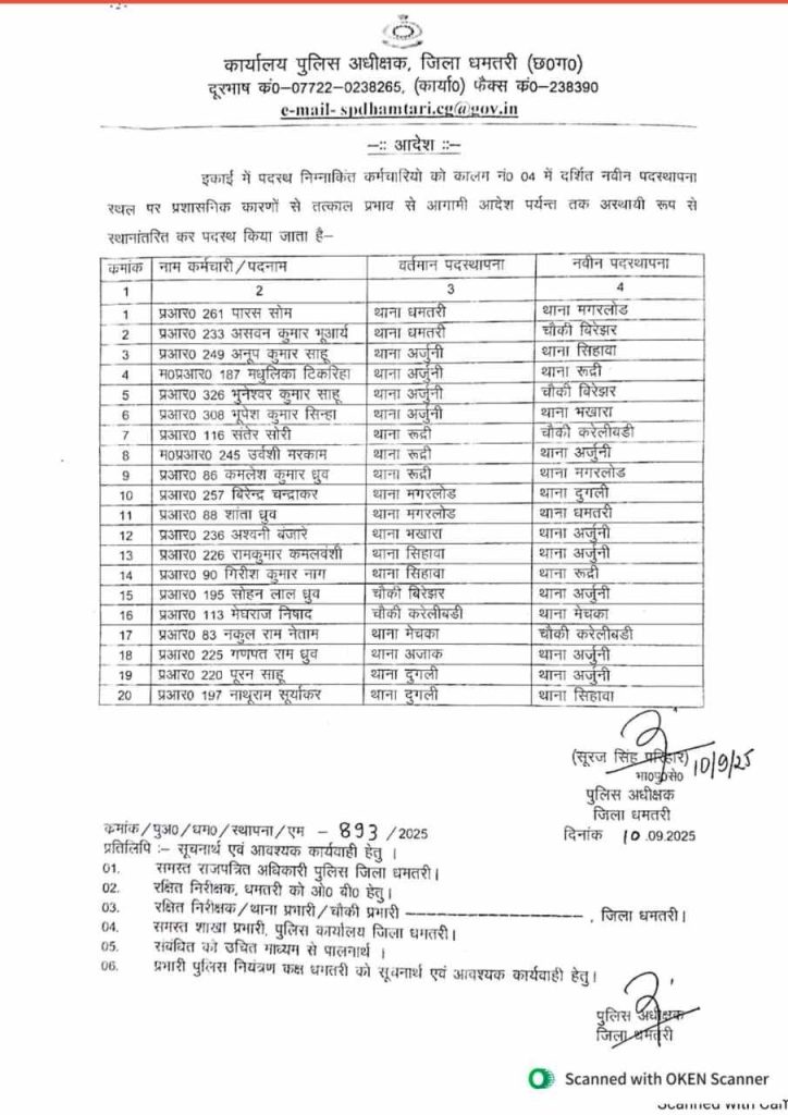 POLICE TRANSFER NEWS : धमतरी. पुलिस विभाग में तबादला आदेश जारी किया गया है. लंबे समय से एक ही स्थान पर जमे पुलिसकर्मियों को इधर से उधर किया गया है. इसका आदेश एसपी सूरज सिंह परिहार ने जारी किया है. आदेश के मुताबिक 2 एसआई,11 एएसआई सहित 20 प्रधान आरक्षकों का तबादला किया गया है.