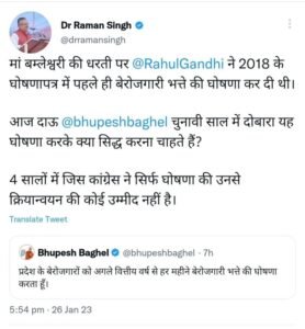 मुख्यमंत्री भूपेश बघेल ने जगदलपुर के लाल मैदान में आयोजित गणतंत्र दिवस समारोह में बेरोजगारों को भत्ता दिए जाने की घोषणा करने के साथ इस पर ट्वीट भी किया. डॉ. रमन सिंह ने ट्वीट पर ट्वीट करते हुए कहा कि मां बमलेश्वरी की धरीत पर राहुल गांधी ने 2018 के घोषणापत्र में पहले ही बेरोजगारी भत्ता देने की घोषणा कर दी थी. आज दाऊ भूपेश बघेल चुनावी साल में दोबारा यह घोषणा करके क्या सिद्ध करना चाहते हैं.