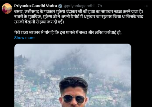 प्रियंका गांधी ने एक्स (Twitter) पर लिखा, “छत्तीसगढ़ के बस्तर में पत्रकार मुकेश चंद्राकर की हत्या की खबर चौंकाने वाली है। खबरों के मुताबिक, मुकेश ने अपनी रिपोर्ट में भ्रष्टाचार को उजागर किया था, जिसके बाद उनकी बेरहमी से हत्या कर दी गई। मैं राज्य सरकार से मांग करती हूं कि इस मामले में सख्त और तत्काल कार्रवाई की जाए, दोषियों को कड़ी सजा दी जाए और मृतक के परिवार को उचित मुआवजा और नौकरी देने पर विचार किया जाए।”