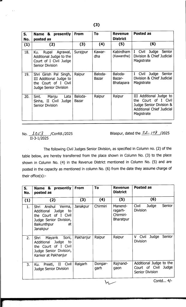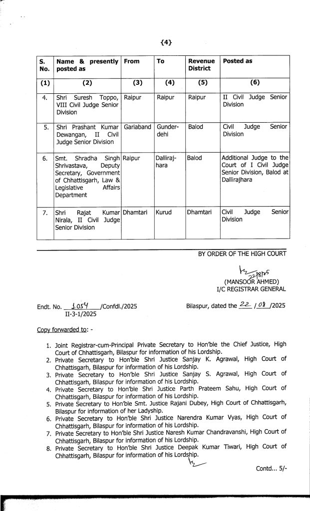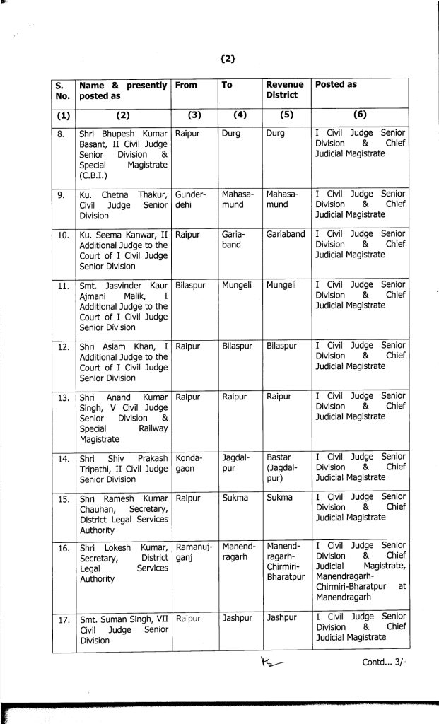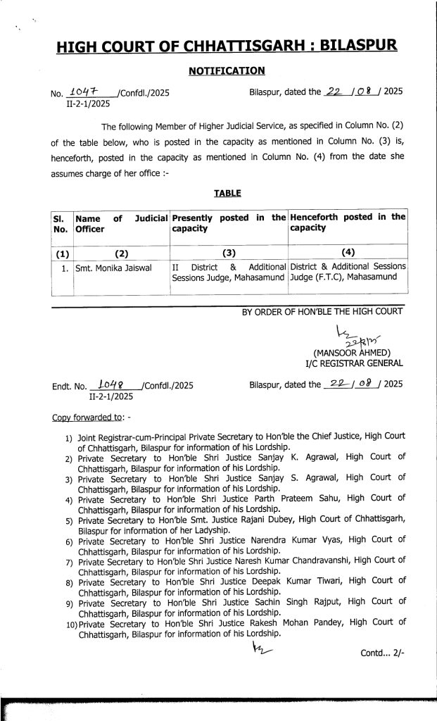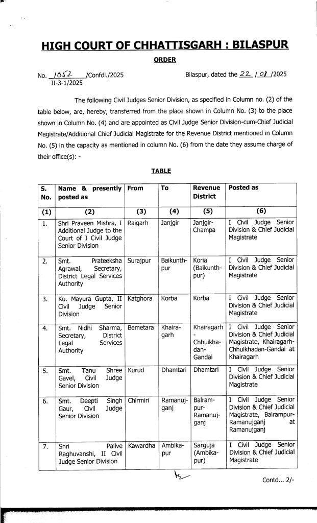 Promotion Breaking : बिलासपुर. बड़े पैमाने पर जजों का प्रमोशन किया गया है. इसके साथ ही उनकी नई पदस्थापना भी कर दी गई है. जारी लिस्ट के मुताबिक 19 मुख्य न्यायिक मजिस्ट्रेटों को अतिरिक्त जिला एवं सत्र न्यायाधीश (एडीजे) के पद पर प्रमोट किया गया है. इसके अलावा 20 जूनियर मजिस्ट्रेट को मुख्य न्यायिक मजिस्ट्रेट के पद पर पदोन्नति दी गई है. इस संबंध में हाईकोर्ट रजिस्ट्रार जनरल ने आदेश जारी किया है.