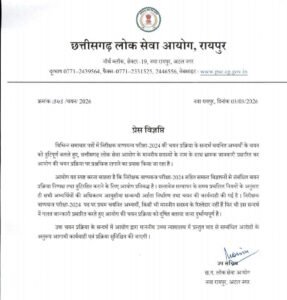 रायपुर। उद्योग विभाग में बॉयलर इंस्पेक्टर (निरीक्षक वाष्पयंत्र परीक्षा-2024) की नियुक्ति को लेकर मचे बवाल के बीच अब PSC ने खुलकर जवाब दिया है। आयोग ने 3 मार्च 2026 को प्रेस विज्ञप्ति जारी कर साफ कहा कि पूरी चयन प्रक्रिया नियमों के तहत और पारदर्शी तरीके से की गई है।