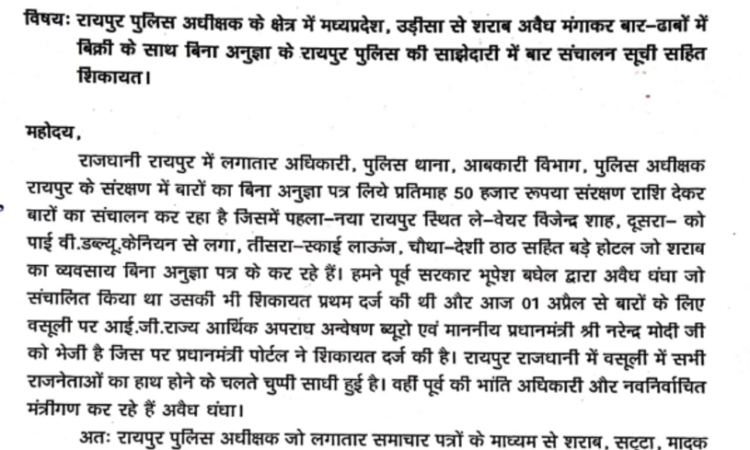 पूर्व सरकार भूपेश बघेल द्वारा अवैध धंधा जो संचालित किया था उसकी भी शिकायत प्रथम दर्ज की थी और आज 01 अप्रैल से बारों के लिए वसूली पर आई.जी. राज्य आर्थिक अपराध अन्वेषण ब्यूरो एवं प्रधानमंत्री नरेन्द्र मोदी को भेजी है, जिस पर प्रधानमंत्री पोर्टल ने शिकायत दर्ज की है। रायपुर राजधानी में वसूली में सभी राजनेताओं का हाथ होने के चलते चुप्पी साधी हुई है। वहीं पूर्व की भांति अधिकारी और नवनिर्वाचित मंत्रीगण अवैध धंधा कर रहे हैं।