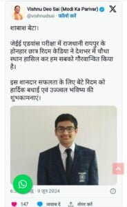 chhattisagrhTrending Now JEE Advanced परीक्षा में रायपुर के छात्र ने हासिल किया चौथा स्थान, सोशल मीडिया के जरिए CM साय ने दी बधाई By: Jiya Choudhary Date: June 9, 2024 रायपुर। जेईई एडवांस परीक्षा में राजधानी रायपुर के होनहार छात्र रिदम केडिया ने देशभर में चौथा स्थान हासिल कर हम सबको गौरवान्वित किया है। इस शानदार सफलता के लिए बेटे रिदम को हार्दिक बधाई एवं उज्ज्वल भविष्य की शुभकामनाएं। TagsCM saiCM Sai congratulated through social mediaRaipur student secured fourth position in JEE Advanced exam Previous articlePM Modi के शपथ ग्रहण समारोह में शामिल होने पहुंचे शाहरूख खान से लेके अंबानी तक , देखें वीडियो Next articleशिव खोड़ी से लौट रही बस पर आतंकियों ने की 40 से 50 राउंड फायरिंग, कई लोगों के हताहत होने की सूचना Jiya Choudharyhttp://www.khabarchalisa.com Share post: FacebookTwitterWhatsAppLinkedinTelegramCopy URL SubscribeI want inI've read and accept the Privacy Policy. #Crime Updates CG CRIME : रेलवे लाइन पर मिले बिना सिर के शव का खुलासा CHHATTISGARH BAND : धर्मांतरण विवाद पर छत्तीसगढ़ बंद, बघेल ने BJP को घेरा CRIME BREAKING : बंद कमरे से एक ही परिवार के 5 शव मिले, इलाके में दहशत LESBIAN PARTNER MURDER CASE : लेस्बियन पार्टनर के प्यार में अंधी मां ने 5 महीने के बेटे का गला दबाया ! CG CRIME : इंस्टाग्राम पर शुरू हुआ प्यार, हत्या पर खत्म हुई कहानी, 3 बच्चों की मां ने … More like thisRelated CG RAID BREAKING : कोयला व्यापारी के ठिकानों पर छापा KC NEWS - 2 hours ago CG RAID BREAKING : Raid on coal trader's premises बिलासपुर,... CHHATTISGARH : स्कूल फेयरवेल के लिए सख्त दिशा-निर्देश KC NEWS - 2 hours ago CHHATTISGARH : Strict guidelines for school farewell रायपुर, 12 फरवरी।... RAIPUR VIRAL VIDEO ACTION : संजय नेताम की वायरल होटल बैठक, अब निलंबित ! KC NEWS - 2 hours ago RAIPUR VIRAL VIDEO ACTION : Sanjay Netam's hotel meeting... RAIGARH PLANT ACCIDENT : ग्रामीणों ने शव सड़क पर रखकर किया जाम KC NEWS - 2 hours ago RAIGARH PLANT ACCIDENT : Villagers blocked the road by...