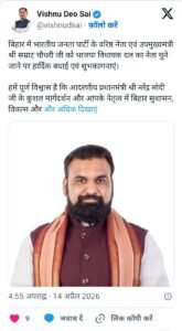 CM Vishnu Deo Sai ने कहा की हमें पूर्ण विश्वास है कि प्रधानमंत्री नरेंद्र मोदी के कुशल मार्गदर्शन और आपके नेतृत्व में बिहार सुशासन, विकास और जनकल्याण की दिशा में नए आयाम स्थापित करेगा। आपका अनुभव और जनसेवा के प्रति आपकी प्रतिबद्धता प्रदेश के विकास को और गति प्रदान करेगी।