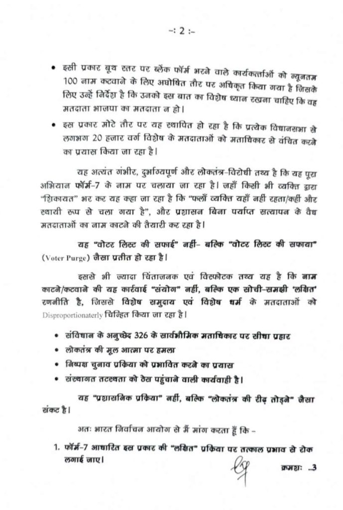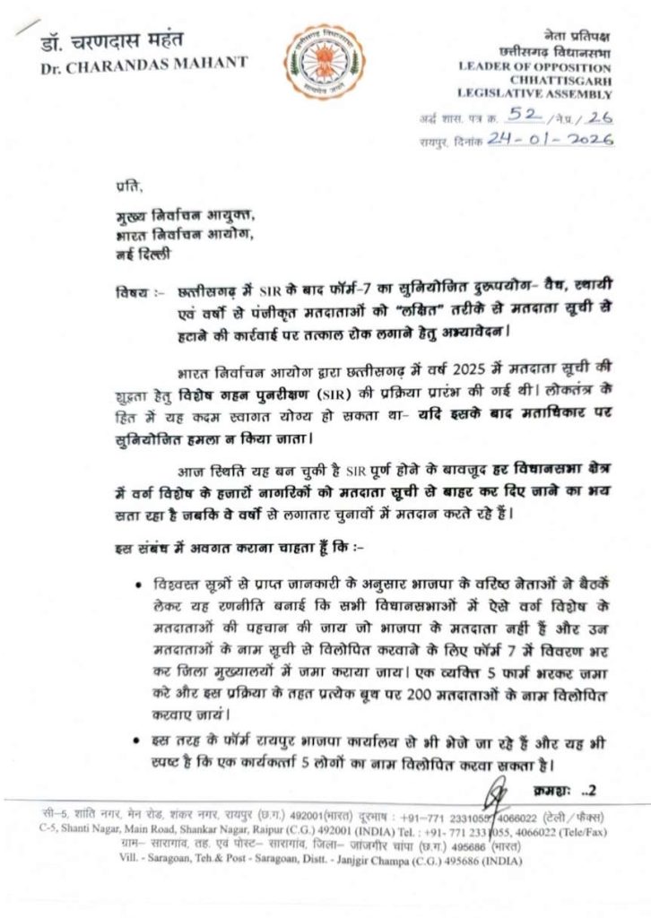 नेता प्रतिपक्ष डॉ चरण दास महंत ने निर्वाचन आयोग को लिखे पत्र में कहा कि छत्तीसगढ़ में वर्ष 2025 में मतदाता सूची की शुद्धता हेतु विषेश गहन पुनरीक्षण SIR की प्रक्रिया प्रारंभ की गई थी. लोकतंत्र के हित में यह कदम स्वागत योग्य हो सकता था – यदि इसके बाद मताधिकार पर सुनियोजित हमला न किया जाता. लेकिन आज स्थिति यह बन चुकी है SIR पूर्ण होने के बावजूद हर विधानसभा क्षेत्र में वर्ग विशेष के हजारों नागरिकों को मतदाता सूची से बाहर कर दिए जाने का भय सता रहा है, जबकि वे वर्षों से लगातार चुनावों में मतदान करते रहे हैं.