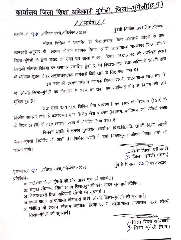 इस पूरे घटनाक्रम को जिला शिक्षा अधिकारी ने गंभीर मानते हुए छत्तीसगढ़ सिविल सेवा आचरण नियम 1965 के नियम 3 (1,2,3) का उल्लंघन बताया है। मामले में त्वरित और सख्त कदम उठाते हुए डीईओ ने छत्तीसगढ़ सिविल सेवा (नियंत्रण, वर्गीकरण एवं अपील) नियम 1966 के नियम 09(क) के अंतर्गत सहायक शिक्षक लक्ष्मण कोलाम को तत्काल प्रभाव से निलंबित किया। निलंबन अवधि के दौरान शिक्षक का मुख्यालय कार्यालय विकासखण्ड शिक्षा अधिकारी लोरमी निर्धारित किया गया है। साथ ही नियमों के अनुसार उन्हें इस अवधि में जीवन निर्वाह भत्ता की पात्रता होगी। शिक्षा विभाग की। इस सख्त कार्रवाई को यह संदेश माना जा रहा है कि शिक्षकों के अनुशासन और आचरण में किसी भी प्रकार की लापरवाही बर्दाश्त नहीं की जाएगी।
