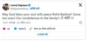 मनोज बाजपेयी ने अपने फैमिली मैन (Family Man 3) के को-स्टार को रोहित बासफोर के निधन के बाद उन्हें श्रद्धांजलि अर्पित की। उन्होंने आधिकारिक एक्स अकाउंट पर पोस्ट शेयर करते हुए लिखा, “भगवान आपकी आत्मा को शांति दे रोहित बासफोर। आप बहुत जल्दी चले गए, हमारी संवेदनाएं आपके परिवार के साथ है। ओम शांति”।