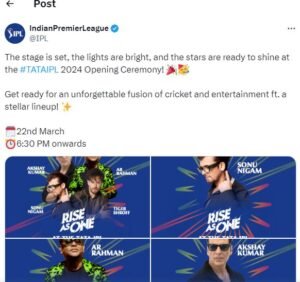 आईपीएल के 17वें सीजन का पहला मुकाबला चेन्नई सुपरकिंग्स और रॉयल चैलेंजर्स बेंगलुरु के बीच होगा। उस मैच से पहले शाम 6:30 बजे से ओपनिंग सेरेमनी की शुरुआत होगी. इसमें बॉलीवुड के खिलाड़ी कहे जाने वाले अक्षय कुमार नजर आएंगे. उनका साथ देने के लिए टाइगर श्रॉफ भी आएंगे। अक्षर और टाइगर के अलावा मशहूर सिंगर सोनू निगम परफॉर्म करेंगे।