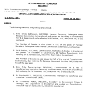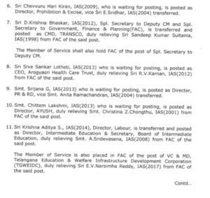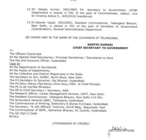 परिवहन आयुक्त आईएएस इलमबरीथी के को आयुक्त, जीएचएमसी के पद पर तैनात किया गया है. खान एवं भूविज्ञान, आईएंडसी विभाग सचिव आईएएस के सुरेन्द्र मोहन को परिवहन आयुक्त बनाया गया है.