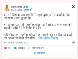 मुख्यमंत्री विष्णु देव साय ने ट्वीट कर कहा कि धमतरी जिले के ग्राम सलोनी में सड़क दुर्घटना में 2 बच्चों के निधन की खबर अत्यंत दुःखद है. इस दुःखद घटना में मृतकों के परिवारजनों को 4-4 लाख रुपये की सहायता राशि देने के निर्देश दिए हैं. मेरी संवेदनाएं मृतकों के परिजनों के साथ है। ईश्वर से दिवंगत बच्चों की आत्मा की शांति और शोक संतप्त परिजनों को संबल प्रदान करने की प्रार्थना करता हूँ.