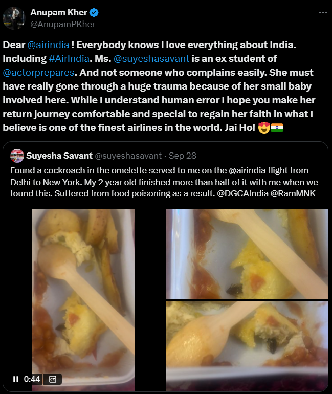 अपनी स्टूडेंट के इस पोस्ट को देखने के बाद अनुपम खेर ने एयर इंडिया फ्लाइट की इस लापरवाही के लिए उन्हें लताड़ लगाई है और खाने को लेकर सुरक्षा बरतने की सलाह दी है। दरअसल अनुपम खेर की एक पुरानी स्टूडेंट ने बीते दिन अपने एक्स अकाउंट पर एक वीडियो शेयर किया था, जिसमें उनके खाने में साफ-साफ मरा हुआ कॉकरोच दिखाई दे रहा है।