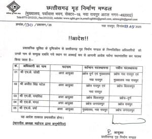 CG HOUSING BOARD TRANSFER BREAKING : गृह निर्माण मंडल में अफसरों के तबादले … देखें लिस्ट