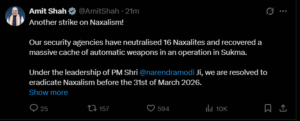 SUKMA NAXAL ENCOUNTER गृह मंत्री अमित शाह ने सोशल मीडिया पोस्ट में कहा कि सुरक्षा एजेंसियों ने इस ऑपरेशन को सफलतापूर्वक अंजाम दिया और बड़ी संख्या में हथियार जब्त किए हैं।
